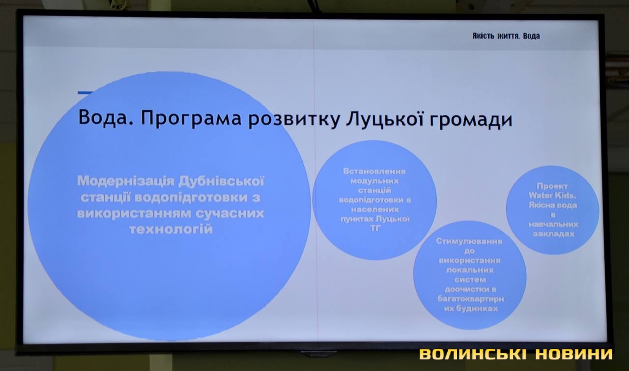 Як розповів директор КП «Луцькводоканал» Віктор Гуменюк під час презентації проєкту «Вода. Програма розвитку Луцької громади» 22 серпня, йдеться про модернізацію Дубнівської станції водопідготовки з використанням сучасних технологій, встановлення модульних станцій водопідготовки в населених пунктах громади, стимулювання до використання локальних систем доочищення води в багатоквартирних будинках і кампанію «Water Kids. Якісна вода в навчальних закладах».Питною водою лучан забезпечують Омелянівський, Гнідавський і Дубнівський водозабори. Основний розташований на вулиці Дубнівський. Він забезпечує, наприклад, 33-й, 40-й мікрорайони та центр міста. Гнідавський і Омелянівський – район ЛПЗ, вулиці Львівську, Гнідавську.«Усі водозабори, зокрема найбільший Дубнівський, побудовано у 1970-х роках на основі застарілих і спрощених технологій очищення води. На жаль, станції збудовано таким чином, що проведення їх реконструкції неможливе без зупинки водопостачання. Однак зупинка водопостачання є неприйнятною для нас. До того ж, реконструкція таких об’єктів довготривала. Тож ми окреслили низку напрямків, якими рухатимемося в найближчому майбутньому. Ми впроваджуватимемо сучасні технології для покращення якості води», – зазначив Віктор Гуменюк.Модернізувати Дубнівську станцію водопідготовки планують протягом 2023-2024 років. Під час робіт буде використано європейську технологію, яка базується на використанні напрацювань провідних виробників обладнання для очищення води. «Луцькводоканал» зможе реконструювати водозабір, не створюючи незручностей для жителів громади.