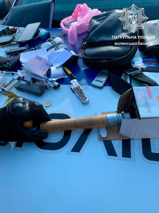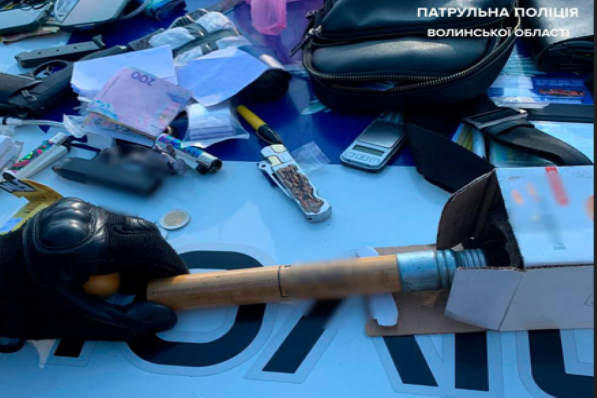 У Луцьку під час патрулювання на вулиці Потебні інспектори помітили автомобіль марки Nissan, в якому виявили ймовірно наркотичні речовини та предмет зовні схожий на зброю.