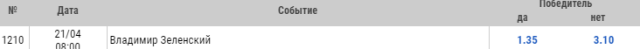 Замість класичного формулювання про одного з переможців, вони представили інше: «Володимир Зеленський – переможець президентських виборів». Варіант «так» оцінений в коефіцієнт 1,35 (якщо ви поставите 100 гривень, то ваш дохід складе 35 гривень – прим. ред).