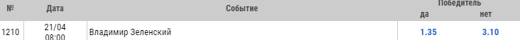 Замість класичного формулювання про одного з переможців, вони представили інше: «Володимир Зеленський – переможець президентських виборів». Варіант «так» оцінений в коефіцієнт 1,35 (якщо ви поставите 100 гривень, то ваш дохід складе 35 гривень – прим. ред).