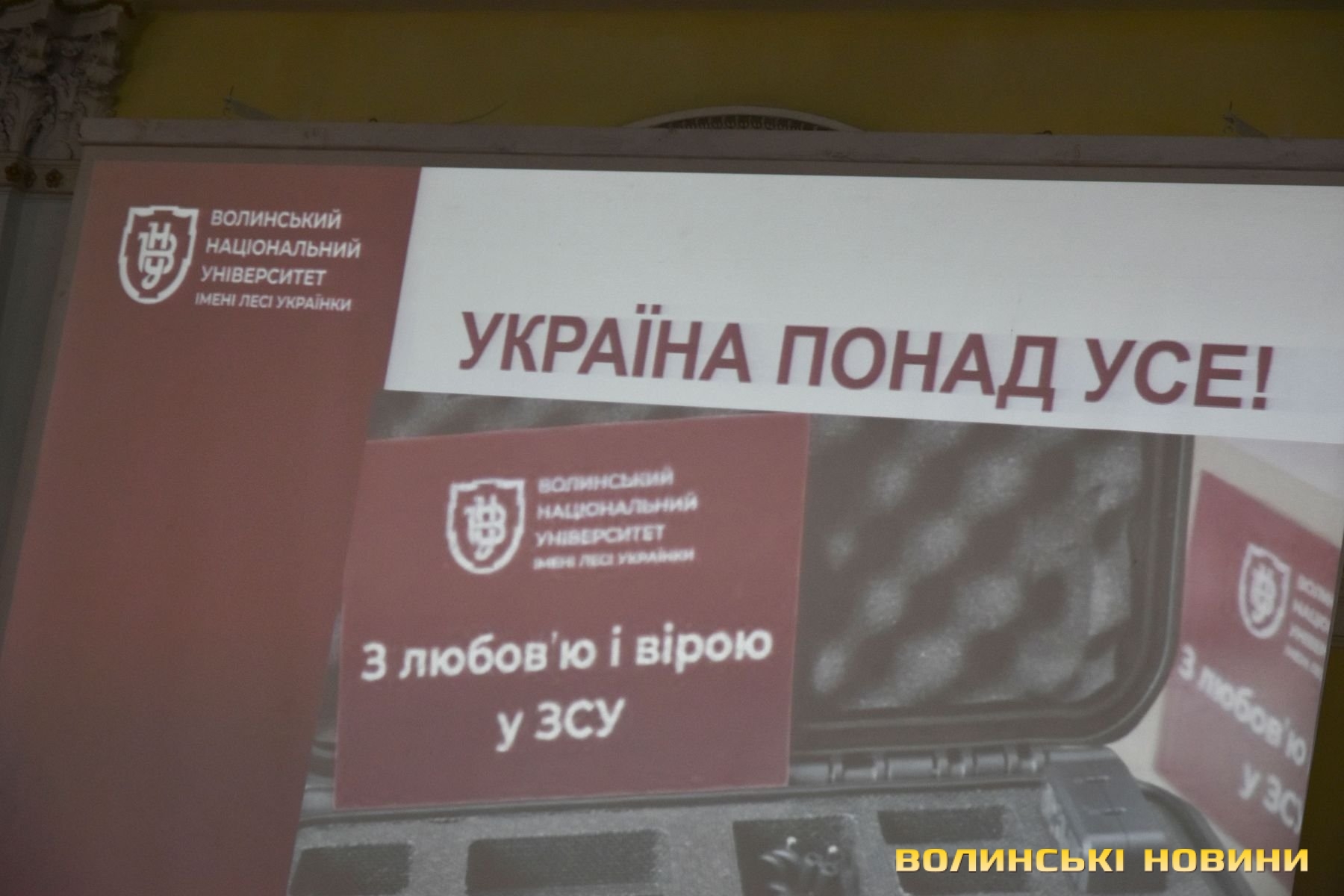Розпочав виступ Анатолій Цьось зі звіту про волонтерську діяльність. Так, університет як юридична установа двічі передавав чималі партії допомоги українським військовим на передову. Викладачі та студенти зібрали майже мільйон гривень, за які придбали воїнам дрони, старлінки та інші речі. Зокрема допомогу передавали 100-й бригаді ТрО, 14-й ОМБр ім. князя Романа Великого, Луганському прикордонному загону, де служить чимало волинян, та 204-й Севастопольській бригаді тактичної авіації. За волонтерську діяльність виш та його працівники отримували подяки від військових формувань.«Волонтерство – це важливий елемент не лише допомоги, а й патріотичного виховання», – закцентував ректор, подякувавши студентам за зібрані на благодійних ярмарках 316 тисяч гривень та працівникам за перерахування одноденного заробітку на загальну суму понад 600 тисяч гривень.