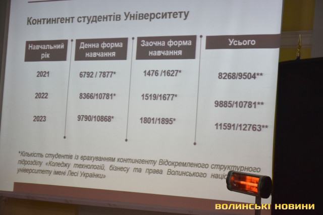 Другу частину виступу Анатолій Цьось присвятив навчальній діяльності. Так, цьогоріч значно зросла кількість зарахованих студентів, а загалом навчаються майже 13 тисяч осіб (з урахуванням Фахового коледжу технологій, бізнесу та права ВНУ). Професорсько-викладацький склад станом на листопад становив 734 особи, з яких 120 докторів наук, 141 професор та 515 кандидатів наук.
