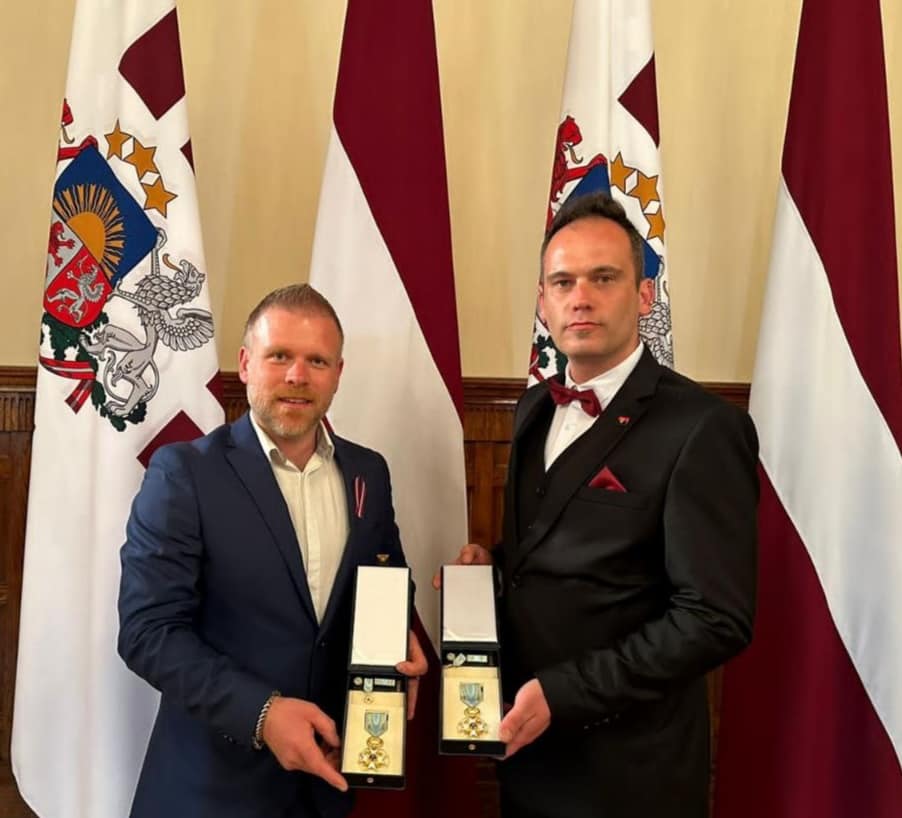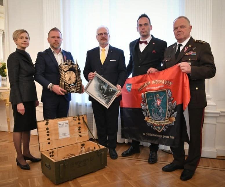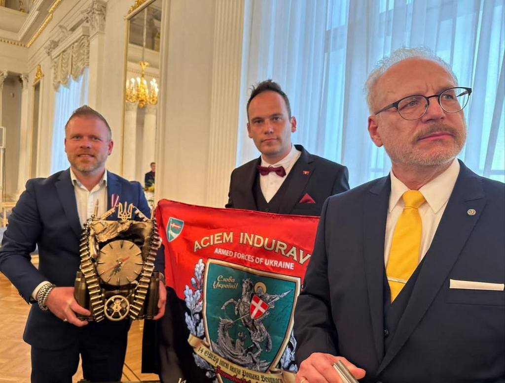 Прапор, сувеніри та подяки від воїнів волинської бригади латвійські волонтери Артурс Крістлібс та Айгарс Лосс передали главі Латвії у Ризькому замку, де президент Латвійської Республіки вручив їм державні нагороди за постійну підтримку України.