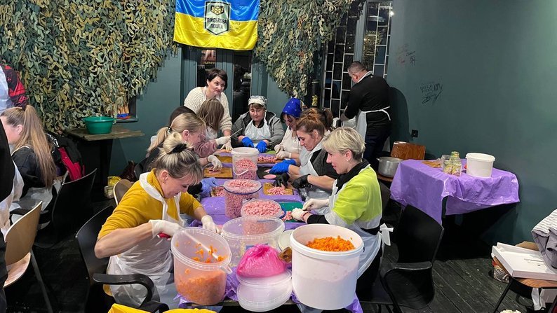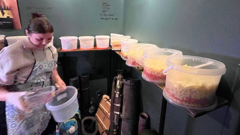 Як повідомила Суспільному волонтерка Наталія Грушка, страви для бійців ЗСУ готували впродовж тижня. З її слів, на 200 кілограмів салату «Олів’є», який нарізали напередодні, пішло понад 50 кілограмів картоплі, 30 кілограмів моркви і ковбаси, 50 літрів майонезу та понад 450 яєць.