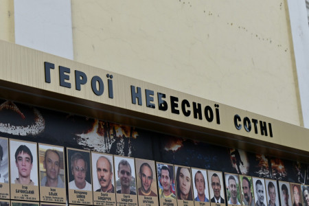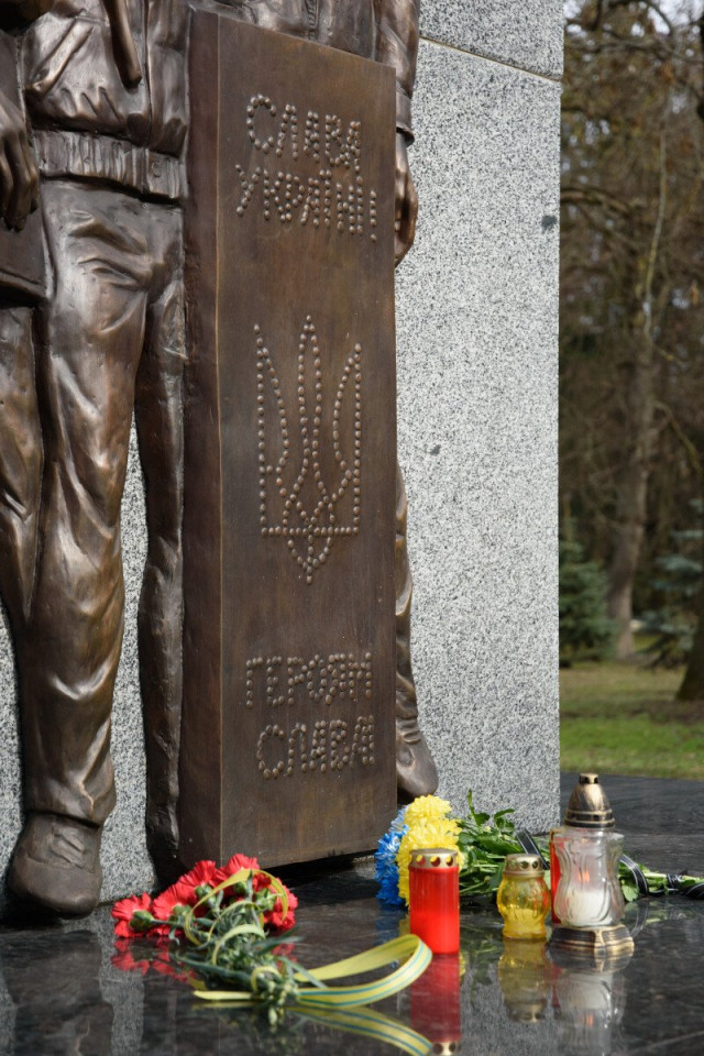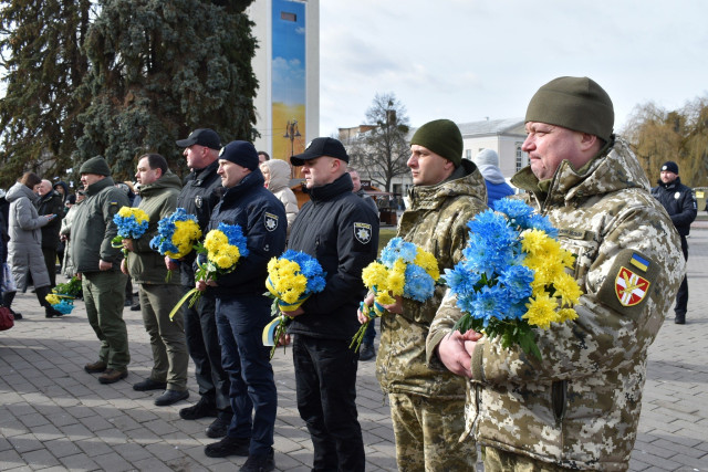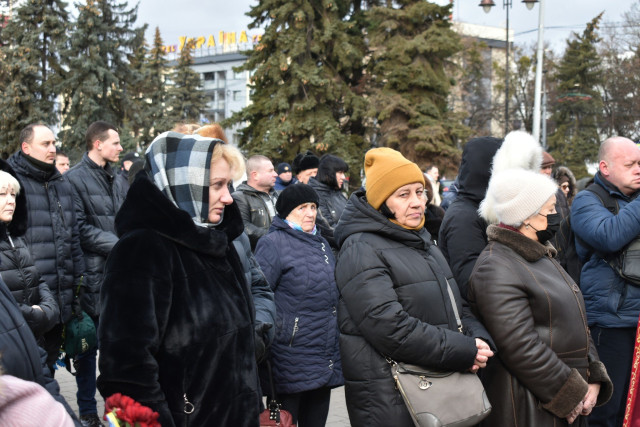 Керівники міста та області поклали квіти до фотостенду «Герої Небесної Сотні – загинули за єдність України» та вшанували пам’ять про загиблих учасників Революції Гідності хвилиною мовчання.