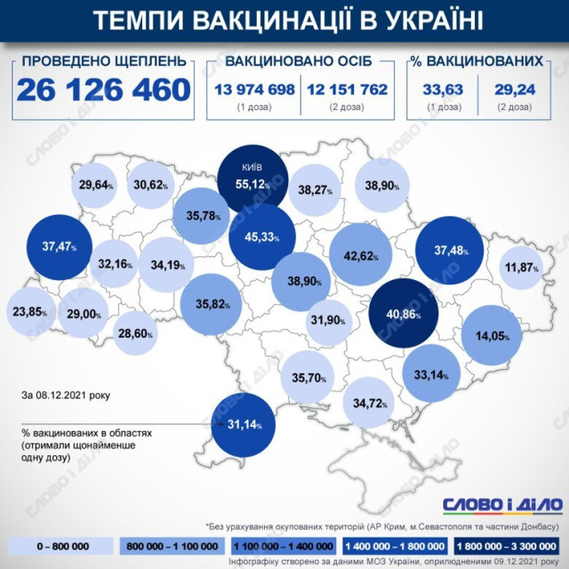 Загалом в Україні з початку кампанії з вакцинації проведено 26 126 460 щеплень. Отримали першу дозу – 13 974 698 людей, завершили вакцинацію (отримали дві дози) – 12 151 762 людини (із них 2 людини отримали першу дозу за кордоном).