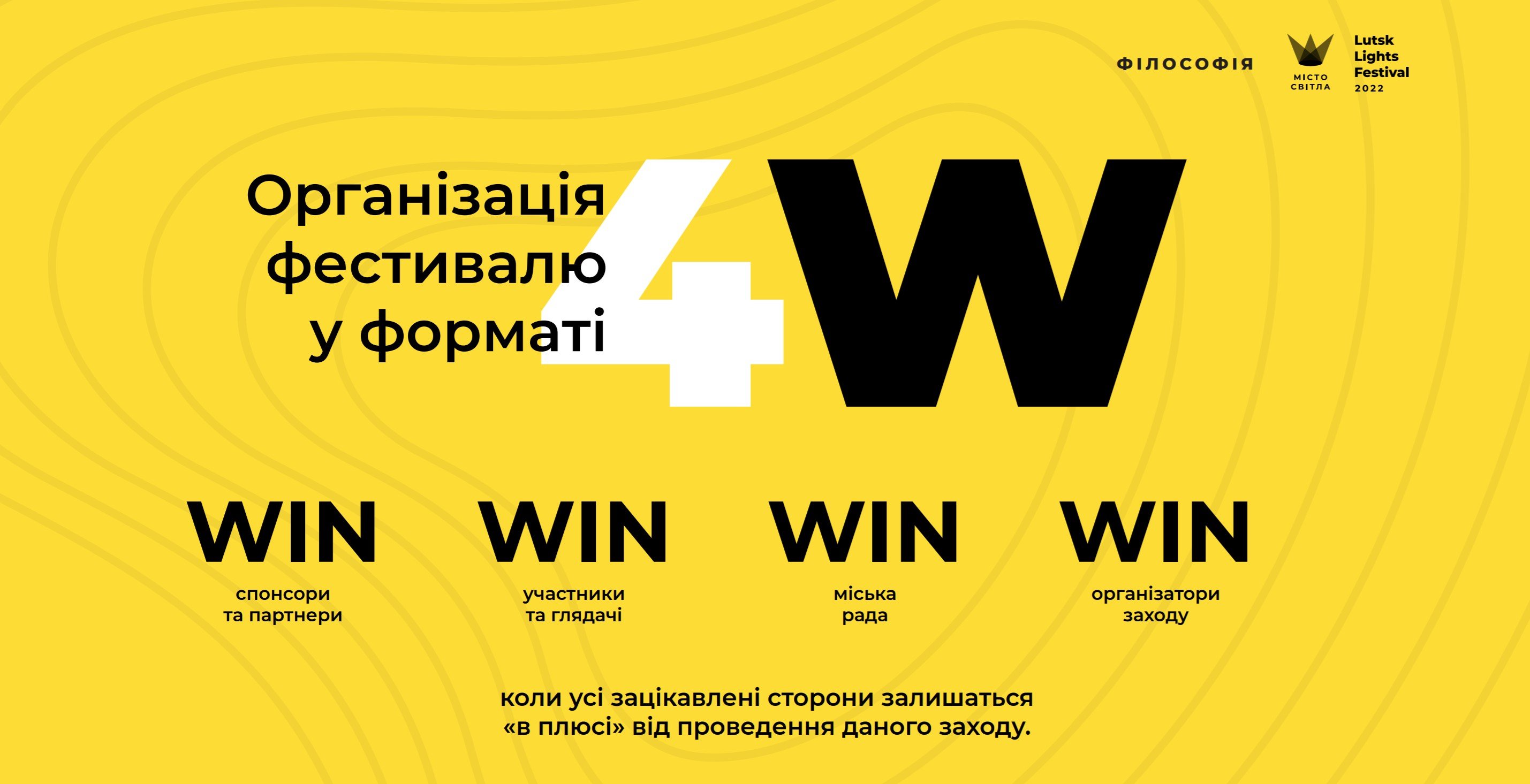 Організація фестивалю базується, у першу чергу, на близькій взаємодії з місцевими органами самоврядування, представниками бізнесу та громадських організацій місцевого та всеукраїнського рівня.Організатор фестивалю Олександр Куява ставить собі за мету досягнути гармонійного формату 4W співробітництва з учасниками та спонсорами.Формат 4WIN розшифровується, як WIN – WIN – WIN – WIN, тобто «4 перемоги» – умови, при яких усі учасники фестивалю залишаться у виграші від проведення заходу.