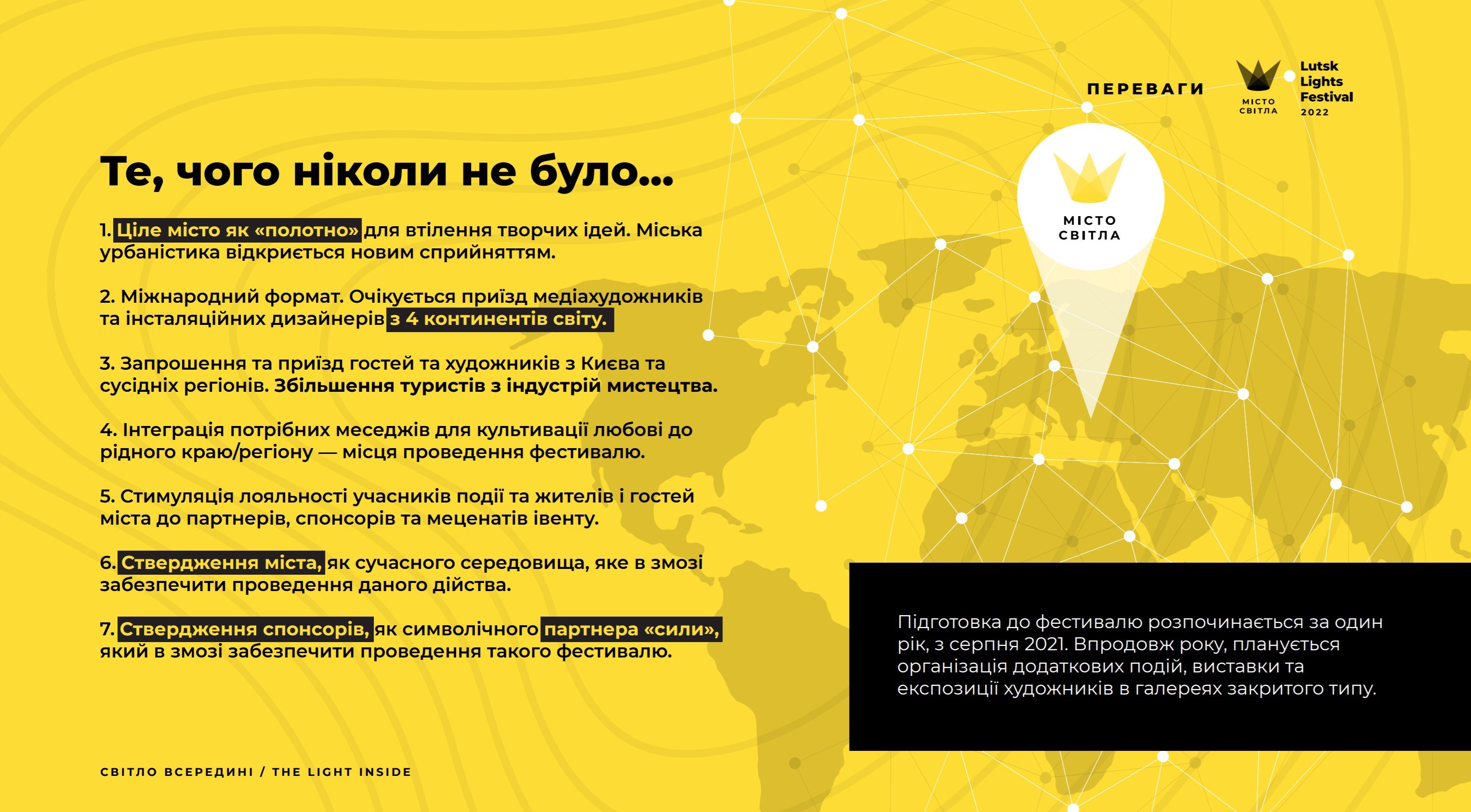 Головна концепція свята – «Світло всередині» – мова про те «світло», що веде людину по життю, надихає, наповнює та спонукає на великі звершення. Фестиваль світла – це не просто масштабний захід, а виклик, «Challenge» для всіх учасників такого дійства.