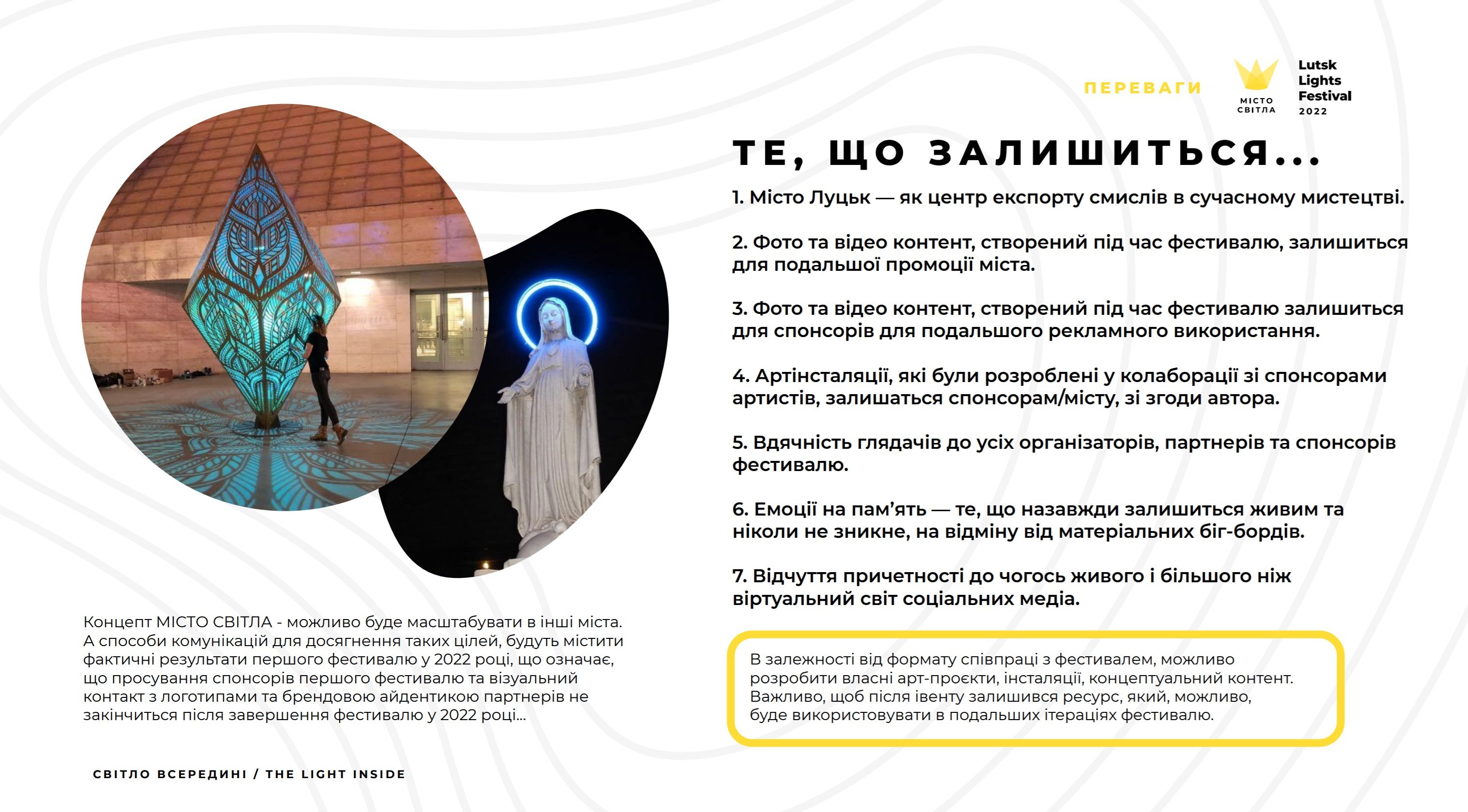 В залежності від формату співпраці з фестивалем, спонсори матимуть можливість розробити власні арт-проєкти, інсталяції та концептуальний контент. Для організаторів не менш важливо, щоб після івенту залишився ресурс, який, можливо буде використовувати у наступних ітераціях фестивалю.Lutsk Lights Festival 2022 – це поєднання духовних, культурних, суспільних та матеріальних благ. Проведення такого івенту гарантовано позитивно позначиться на кожному окремому учаснику й на місті та регіоні вцілому.