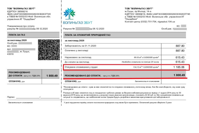 У грудні рахунки волинян міститимуть інформацію про вартість природного газу, спожитого в листопаді, та обсяг очікуваного споживання у грудні.