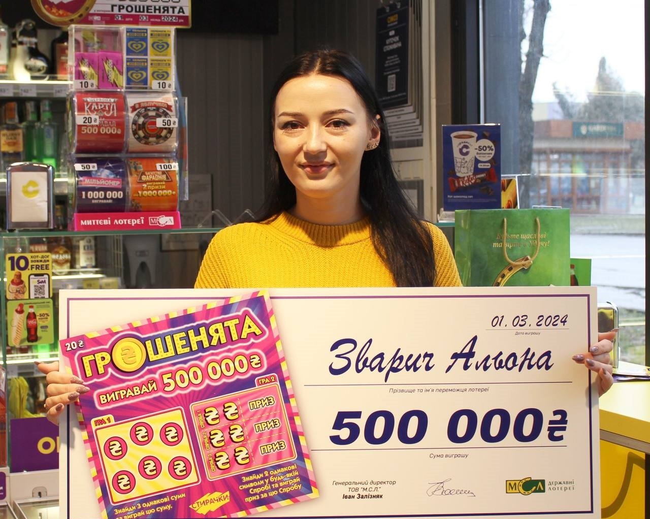 28-річна Альона Зварич з Володимира виграла 500 000 гривень у миттєву лотерею-стирачку «ГРОШЕНЯТА». 28-річна військовослужбовиця, яка зараз перебуває у декреті, придбала лотерейний білет за 20 гривень в одному із маркетів мережі «Сім23».
