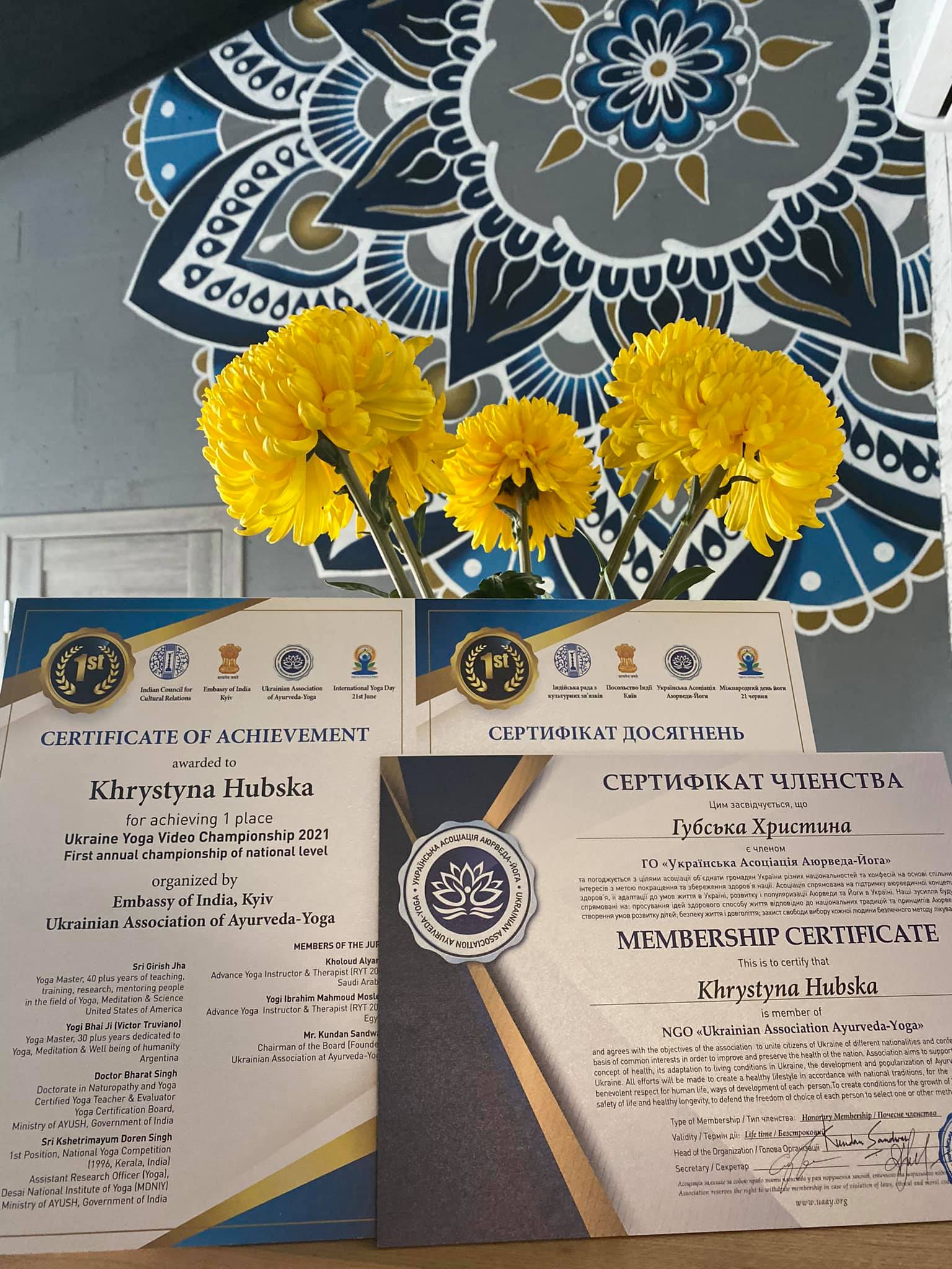 «Сьогодні я отримала офіційну нагороду від посольства Індіі та Міжнародної асоціації йоги та аюрведи за перемогу в чемпіонаті України з йоги!