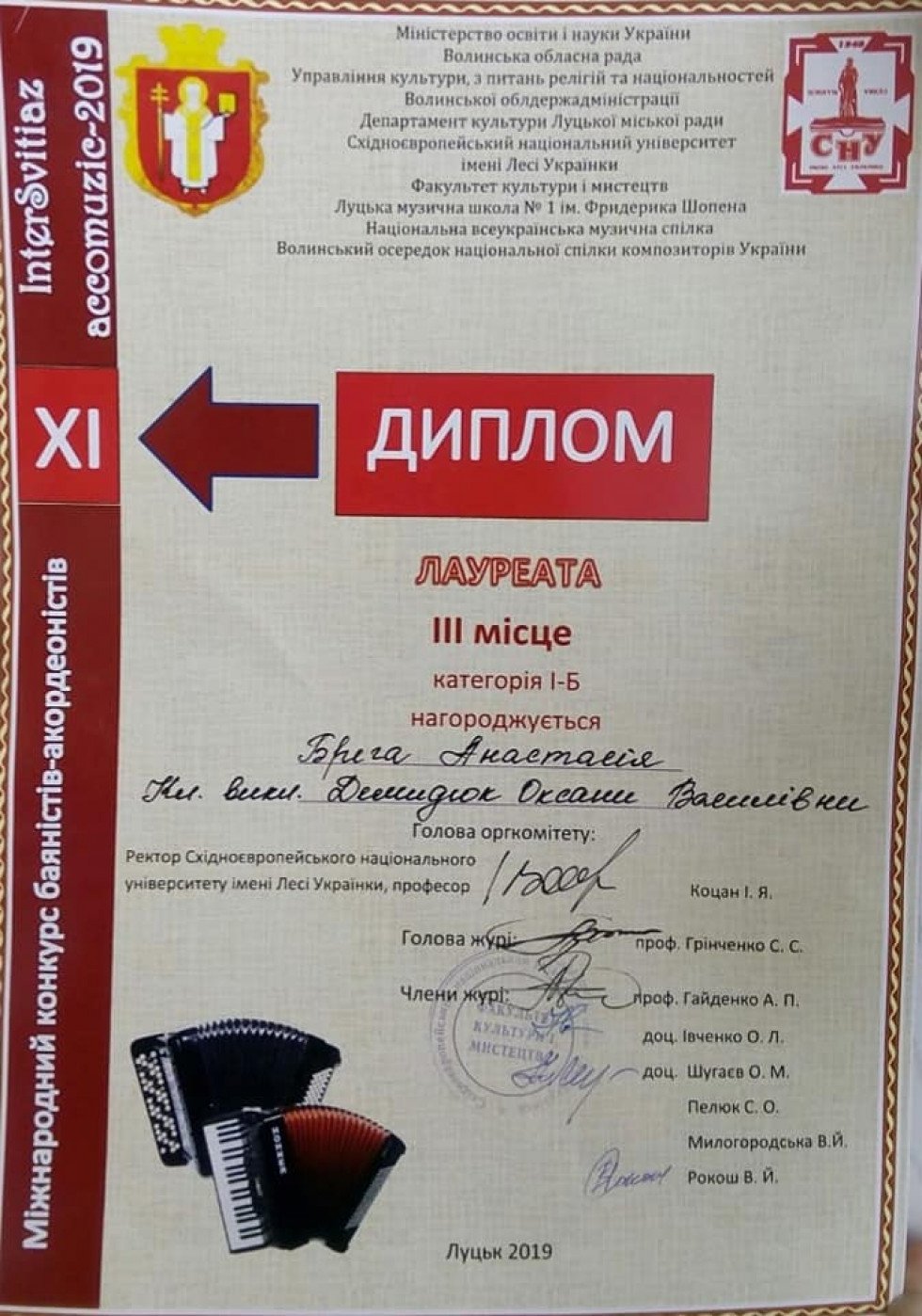 ХІ Міжнародний конкурс баяністів-акордеоністів «InterSvitiaz accomuzic-2019» відбувся у Луцьку 20-23 березня. Анастасія Брега із Шацька (викладач Оксана Василівна Демидюк) здобула ІІІ місце у своїй віковій категорії.