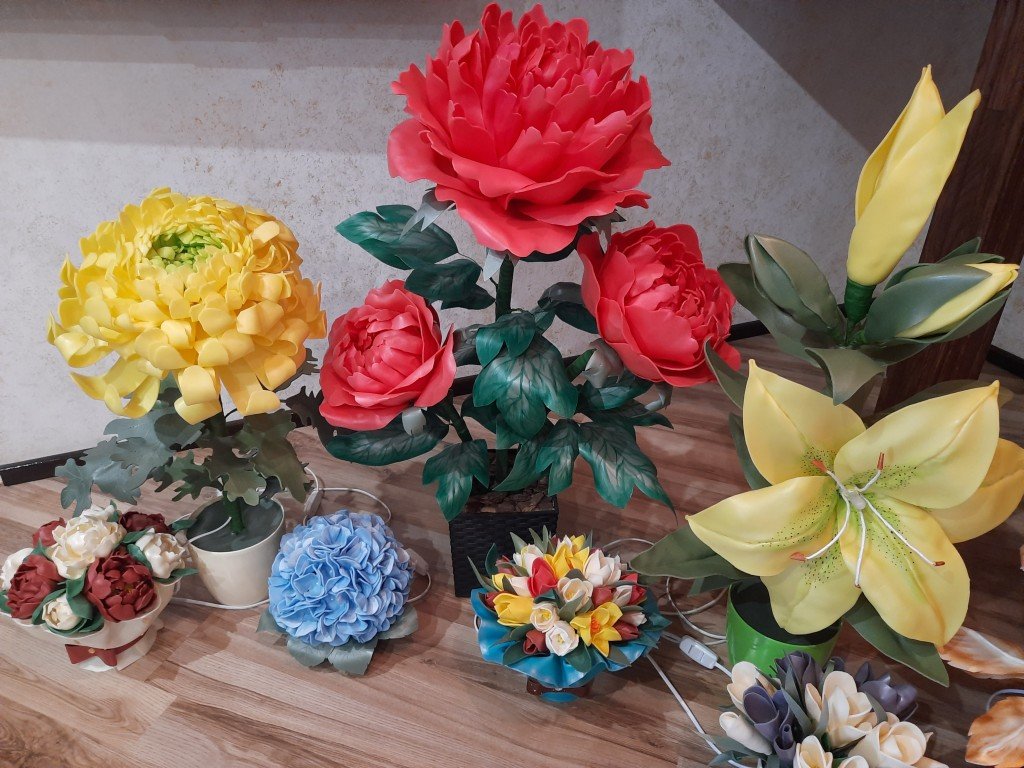 Таке захоплення у пані Лариси з’явилося рік тому. Відтоді вона працює зі спіненим поліетиленом, інакше кажучи – ізолоном. Виготовляє з нього ростові квіти, підлогові та настільні світильники. У творчому арсеналі – від кількасантиметрових квіток, які легко вміщаються в долоню, до кількаметрових, більших від самої майстрині.Ларисі Гембік, напевно, не може бути важчого випробування, аніж уникати творчої роботи. Каже, в такі моменти втрачає сама себе. Вірна своїм захопленням, навіть у новозбудованому будинку самостійно розмалювала стіни і зробила барельєфи, а доповнила дизайн приміщення авторськими світильниками та ростовими квітами. Лариса зізнається: надивилася тієї краси в інтернеті. Спершу зробила на пробу троянду, потім – двометрову орхідею.Пізніше були лілія, хризантема, півонія, магнолія, тюльпани, гортензії і навіть лялька. Такі квіткові композиції приносять естетичне задоволення, а у вечірній час деякі з них освітлюють кімнату. У цьому, розповідає жінка, їй допомагає син, який опановує професію електрика.