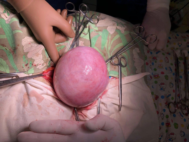 Пухлина була величиною з волейбольний м’яч. Рік тому жінка помітила, що в неї виріс живіт, який імітував 5-місячну вагітність. Жодних проблем, окрім болючих місячних, не відчувала. Думала, просто поправилася. А оскільки має суттєві проблеми з 10-річним сином, то й особливої уваги собі не приділяла.