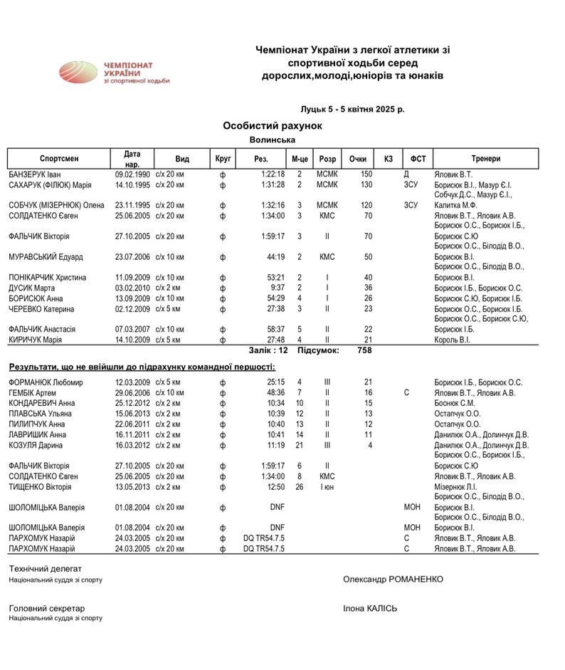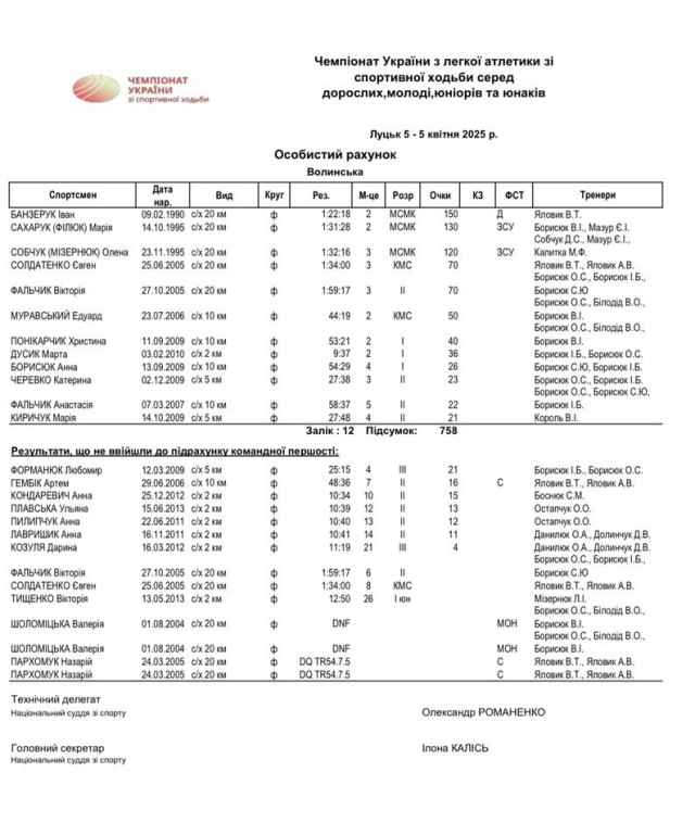 5 квітня в Луцьку відбувся чемпіонат України зі спортивної ходьби серед дорослих, молоді, юніорів та юнаків. У загальнокомандному заліку Волинь посіла перше місце.