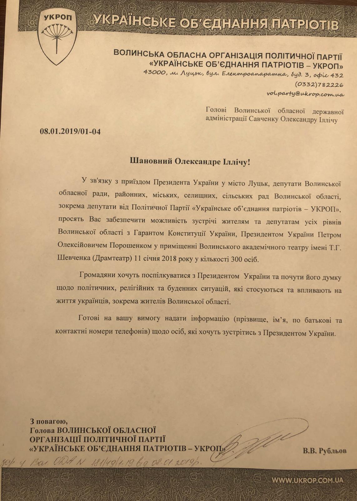 «Шановний Олександре Іллічу! У зв'язку з приїздом Президента України у місто Луцьк, депутати Волинської обласної ради, районних, міських, селищних, сільських рад Волинської області, зокрема депутати від Політичної Партії «Українське об’єднання патріотів - УКРОП», просять Вас забезпечити можливість зустрічі жителям та депутатам усіх рівнів Волинської області з Гарантом Конституції України, Президентом України Петром Олексійовичем Порошенком у приміщенні Волинського академічного театру імені Т.Г. Шевченка (Драмтеатр) 11 січня 2018 року у кількості 300 осіб.