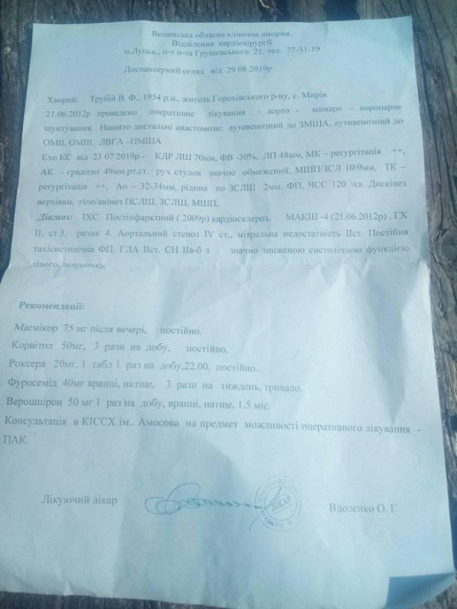 «Біда одна не ходить! Жителю села Мирків Горохівського району Волинської області Трубію Віталію Федоровичу потрібні кошти на операцію, а саме – заміну серцевого клапана (вибачте, якщо написав неправильно медичний термін). Сума для його родини непосильна, оскільки операцію потрібно провести терміново – за 3-4 дні. Допоможіть, хто скільки зможе, біда з друзями не така страшна», – йдеться у повідомленні.