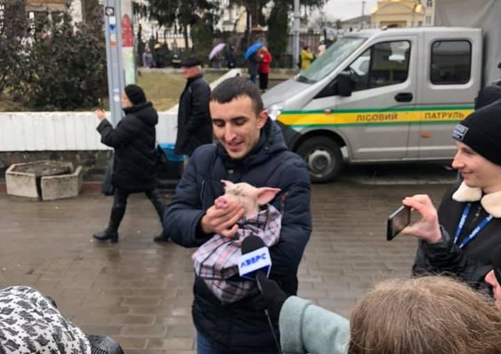 Волинянин привіз на Театральний майдан Луцька, де очікують на приїзд Петра Порошенка, порося. Чоловік каже, що це – «малий Свинарчук» і він його хоче подарувати президенту.