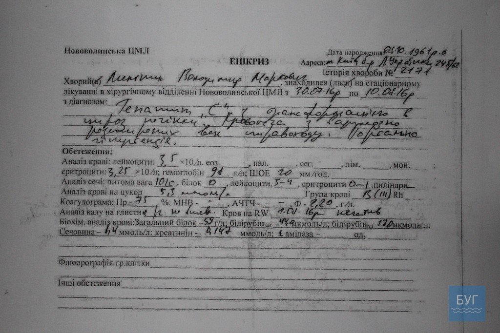 Хворобу виявили в кінці 2014-го року. За цей період часу у нього було дві внутрішні коровотечі, Володимир декілька днів лежав у комі, інформує БУГ.