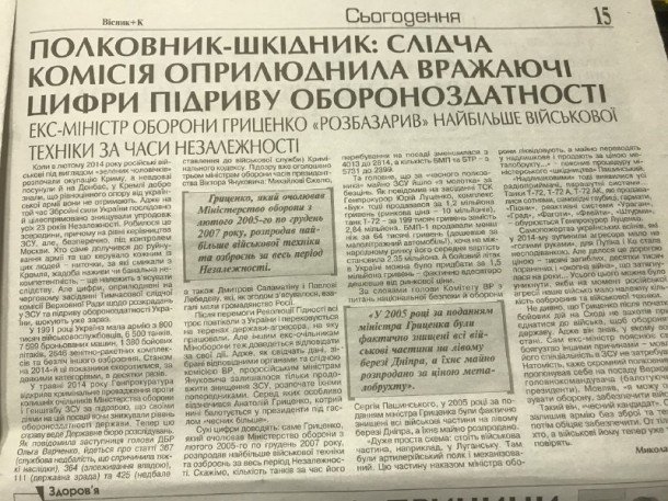 Однак після цього «Вісник +К» розмістив «чорнуху» про кандидата у президенти Анатолія Гриценка. Стаття називається «Полковник-шкідник: слідча комісія оприлюднила вражаючі цифри підриву обороноздатності», пише Під прицілом.