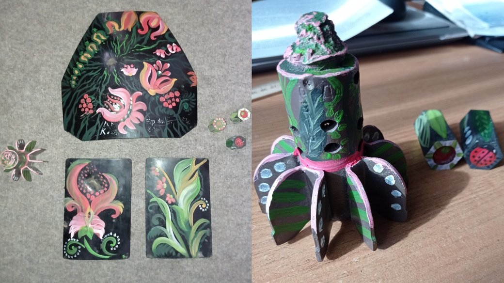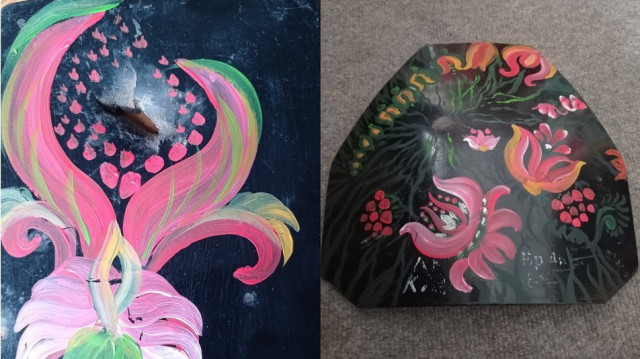 Військові плити і хвостовик мінометної міни калібру 82 мм привіз із передової на Волинь військовослужбовець ЗСУ Владислав Антічев. Їх Світлана Солодун декорувала орнаментами у вигляді стилізованих квітів у вигляді лілій.