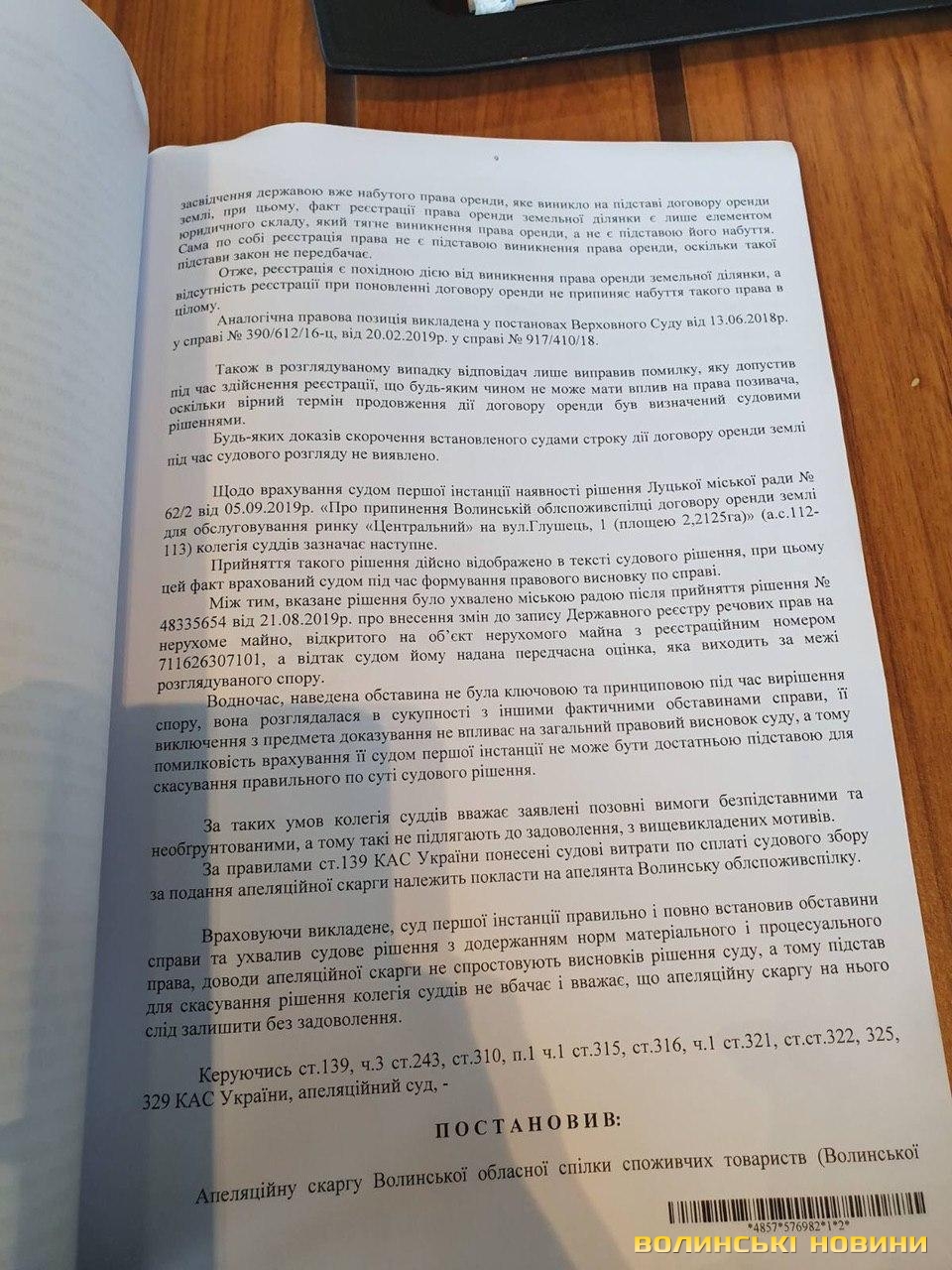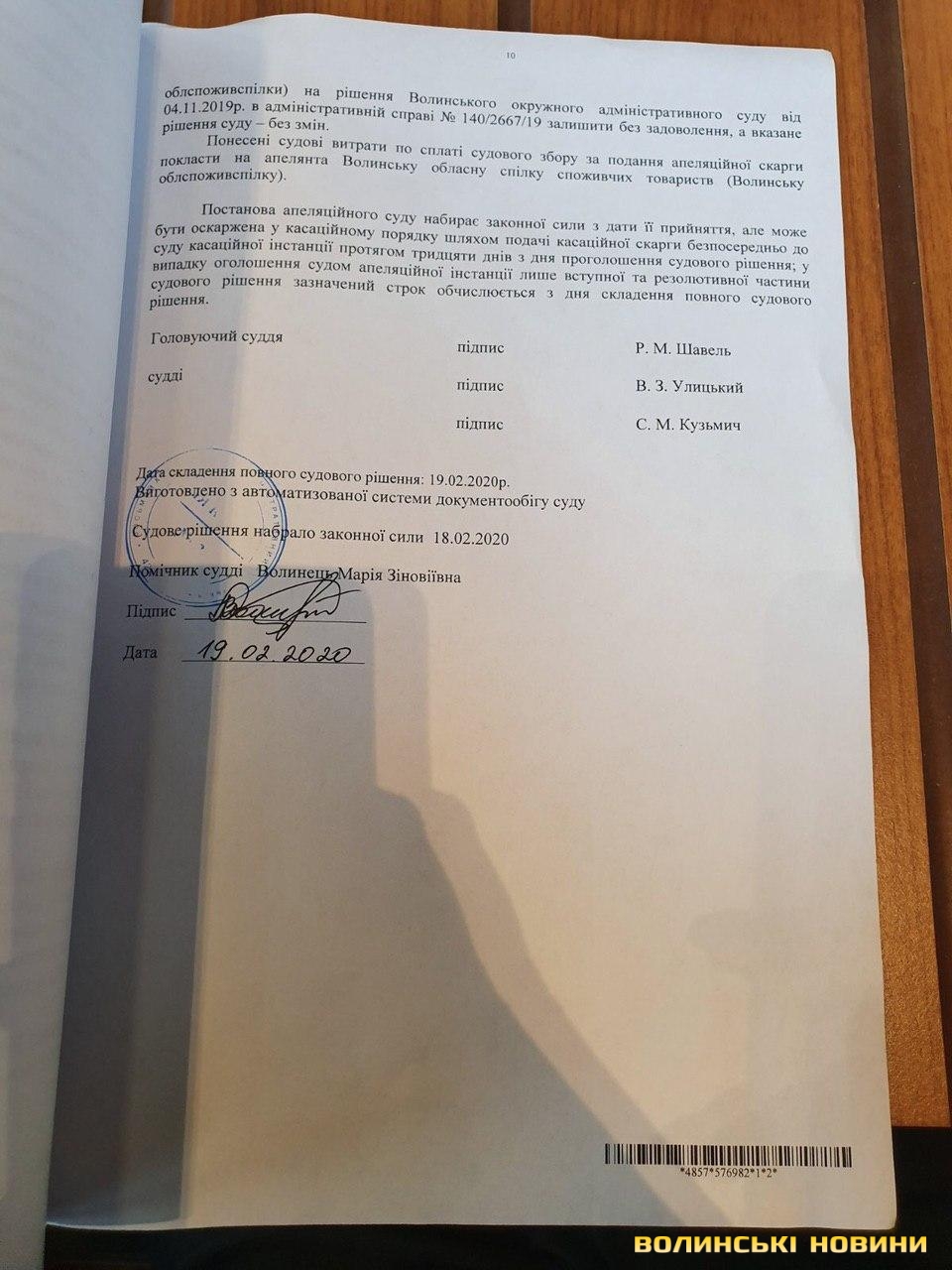 Восьмий апеляційний адміністративний суд у Львові 18 лютого відхилив апеляційну скаргу Волинської облспоживспілки на рішення Волинського окружного адміністративного суду від 4 листопада.
