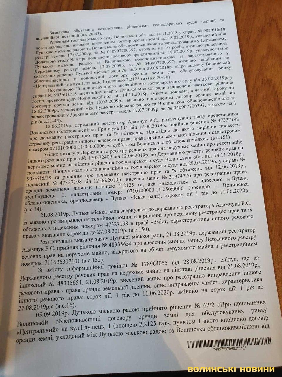 Облспоживспілка звернулася до суду, аби той визнав протиправним і скасував рішення держреєстратора про внесення змін до запису Державного реєстру речових прав на нерухоме майно, яким зменшено дію строку договору оренди земельної ділянки у Луцьку на вулиці Глушець, наданої спілці для обслуговування ринку «Центральний», з 11.06.2020 р. до 27.08.2019 р.