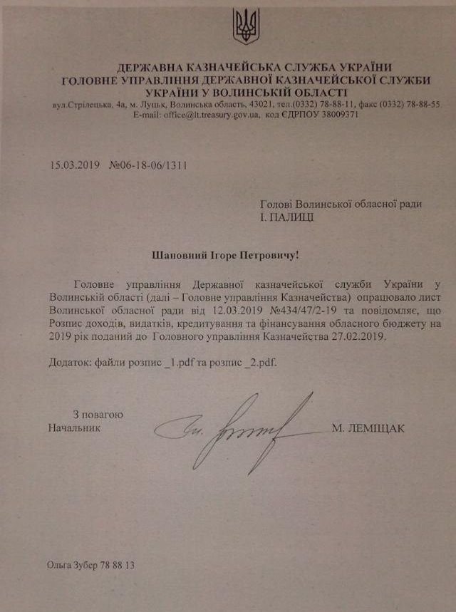 Про це стало відомо з відповіді Головного управління Державної казначейської служби України на офіційний запит голови Волинської обласної ради Ігоря Палиці.