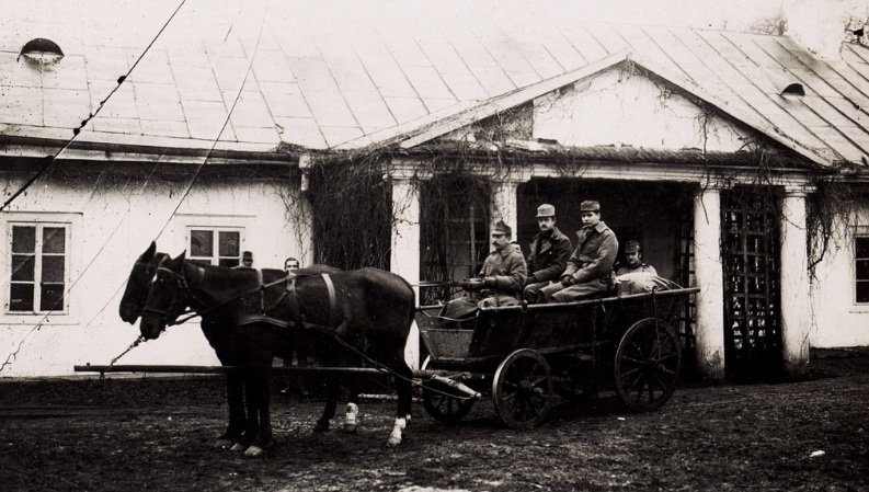 «Представники австро-угорської тріангуляційної комісії на фоні садиби в селі Калусів (Гряди), 1916 р. Тріангуляційна комісія здійснювала геодезичні виміри для складання воєнних карт в роки Першої світової війни», – пояснив історик Юрій Велінець.Представники австро-угорської тріангуляційної комісії, 1916 р.