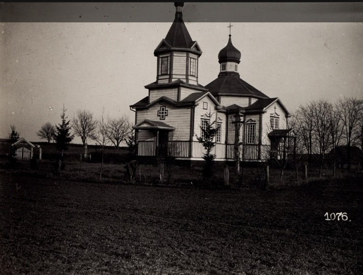 Найперше нашу увагу привертають світлини храму. На кадрі бачимо новий дерев’яний храм Казанської ікони Божої Матері, зведений у 1904 році. У часи Першої світової війни святиня мала всього десять років.