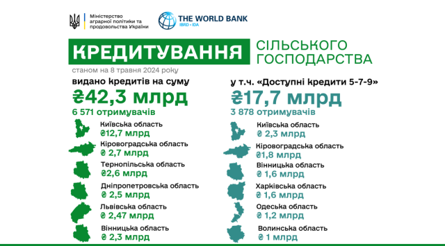 Зазначається, що найбільший обсяг кредитів за різними програмами отримали аграрії Київської (12,7 млрд грн виділено для 615 підприємств), Кіровоградської (2,7 млрд грн – для 811), Тернопільської (2,6 млрд грн – для 259) та Дніпропетровської областей (2,5 млрд грн – для 475).