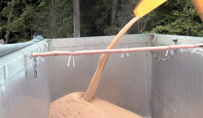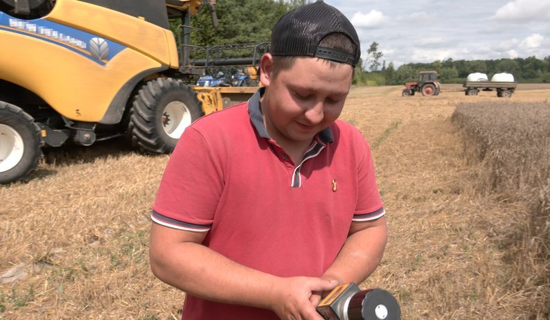 Агроном Дмитро Харчун щодня вимірює вологість зерна, перш ніж комбайн вийде у поле.Відвантажене зерно одразу везуть до елеватора. В один зерновоз вміщається до 25 тонн.