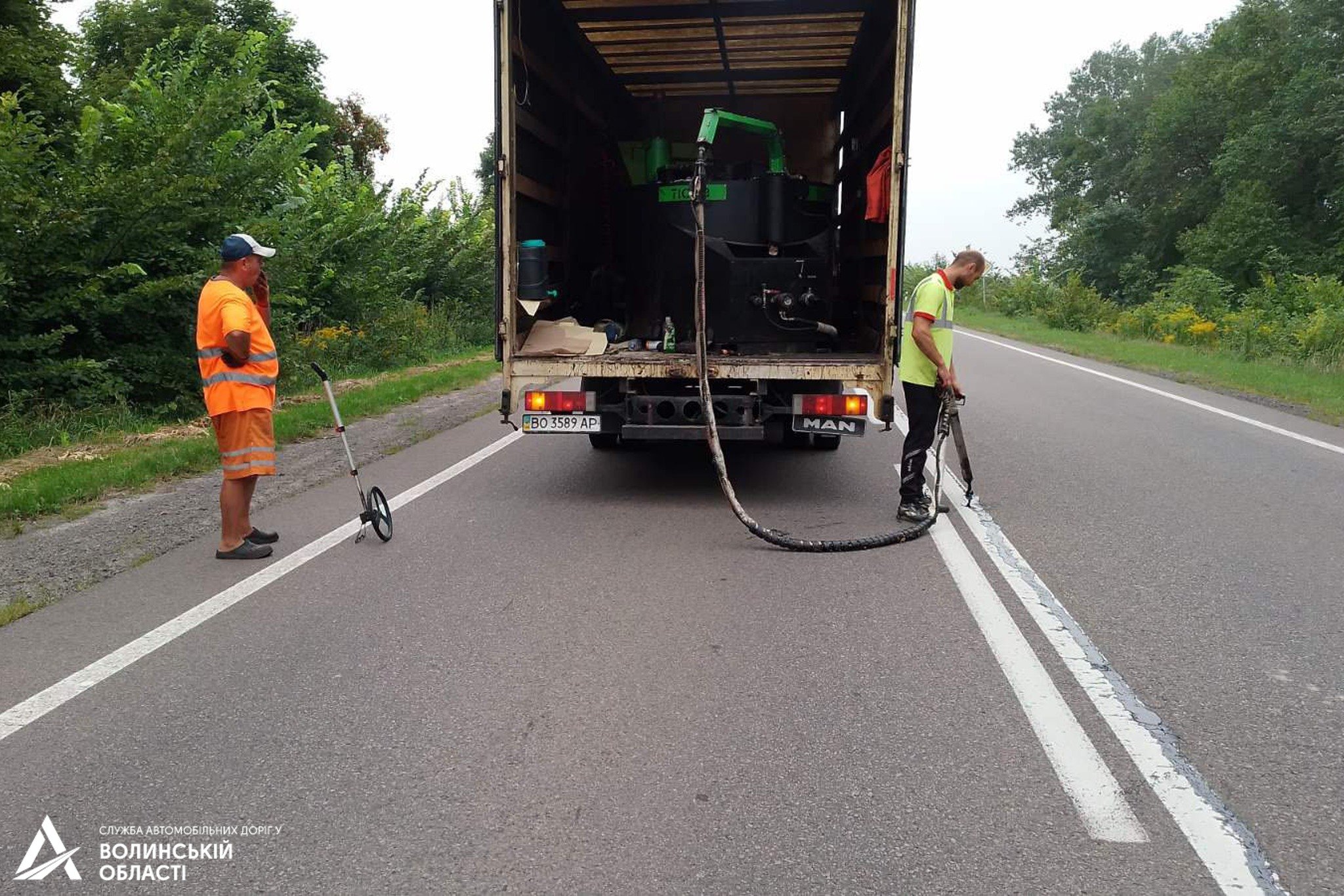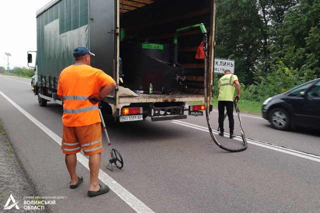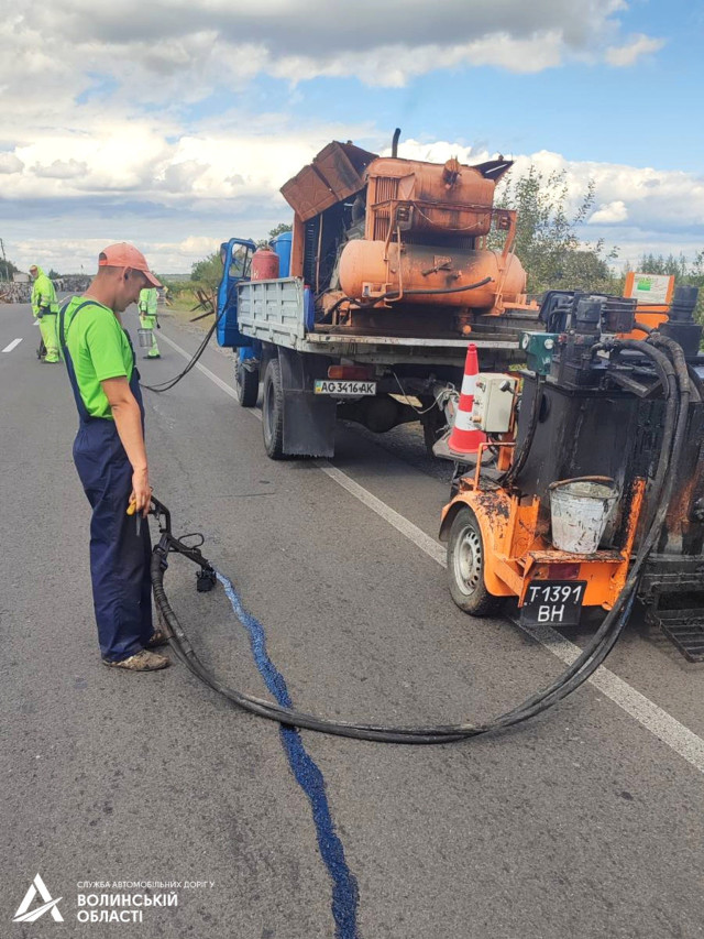 Служба автомобільних доріг у Волинській області здійснює поточний ремонт доріг, заливаючи тріщини.