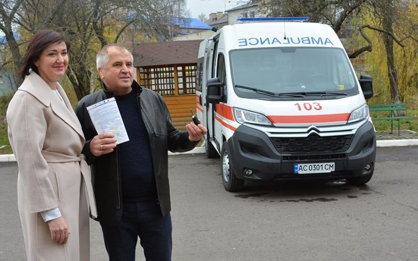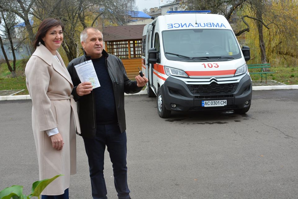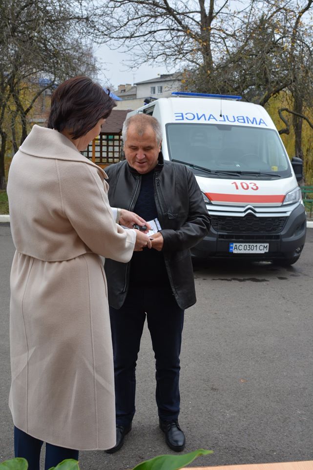 Голова обласної ради Ірина Вахович вручила ключі від новенького автомобіля швидкої допомоги виконувачу обов'язків директора КП «Волинський обласний центр екстреної медичної допомоги та медицини катастроф» Володимиру Шмалю.