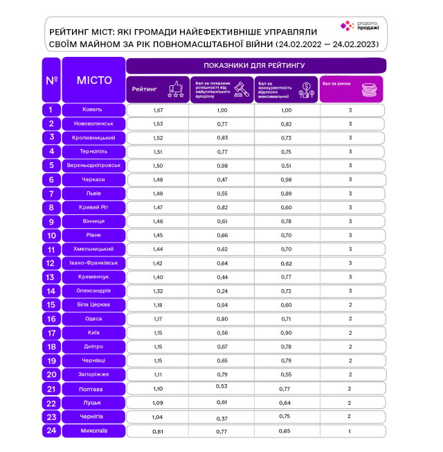 З-поміж усіх міст, які працювали з системою під час року повномасштабної війни, до рейтингу відібрані міста, у котрих за рік було понад 40 успішних аукціонів.