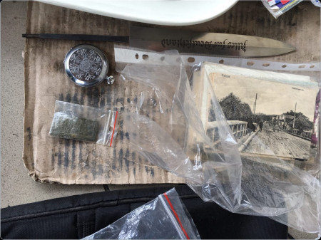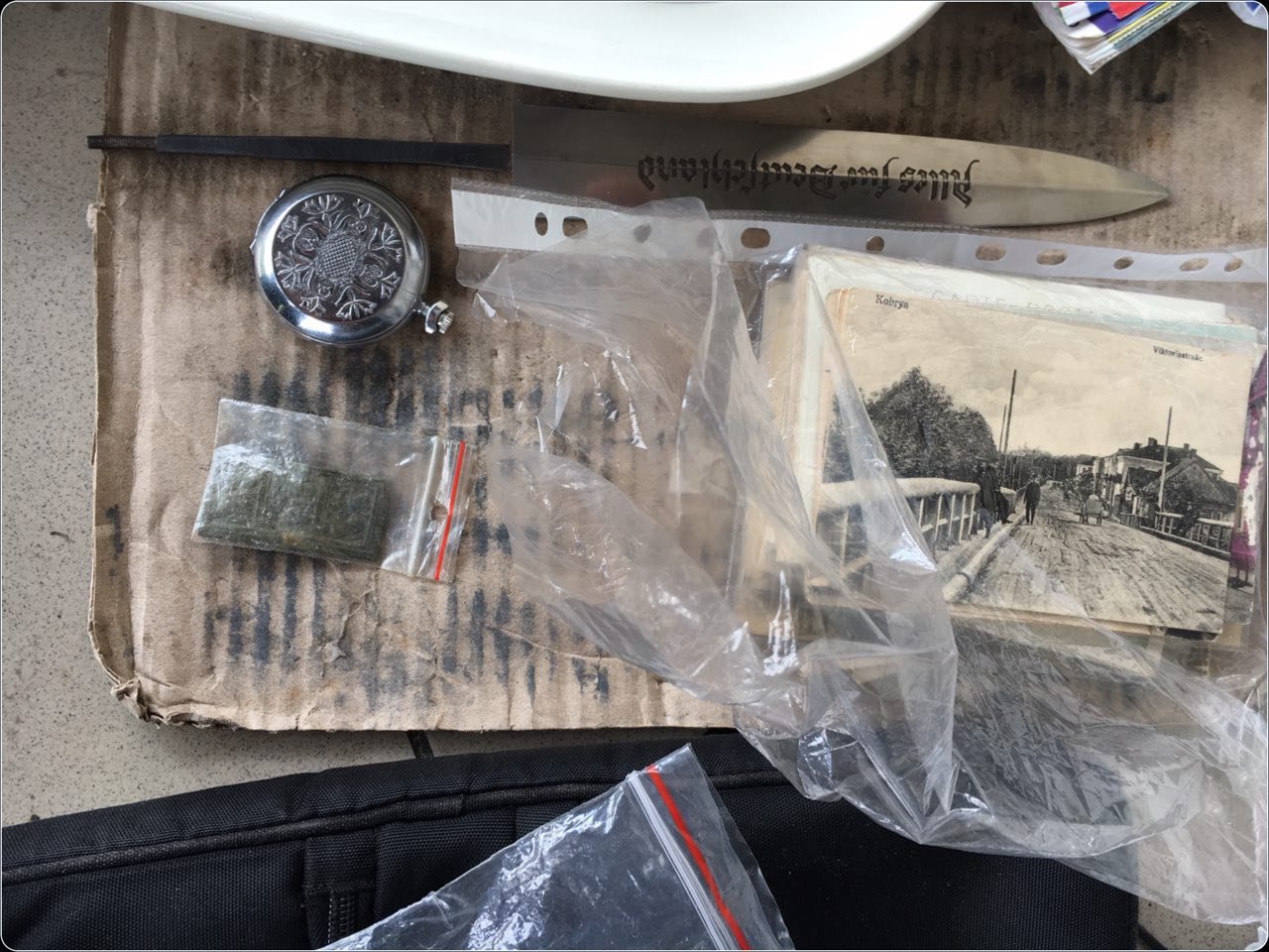 Зокрема, на дні картонного ящика з особистими речами лежав металевий клинок без рукоятки з гравірувальним написом «AllesfurDeutschland». Крім того, у папці темно-зеленого кольору виявлено 59 листівок різних років випуску, які мають ознаки культурних цінностей. В одній з кишень дорожньої сумки був прихований кишеньковий годинник, а в поличці під кермом автомобіля – ікона.