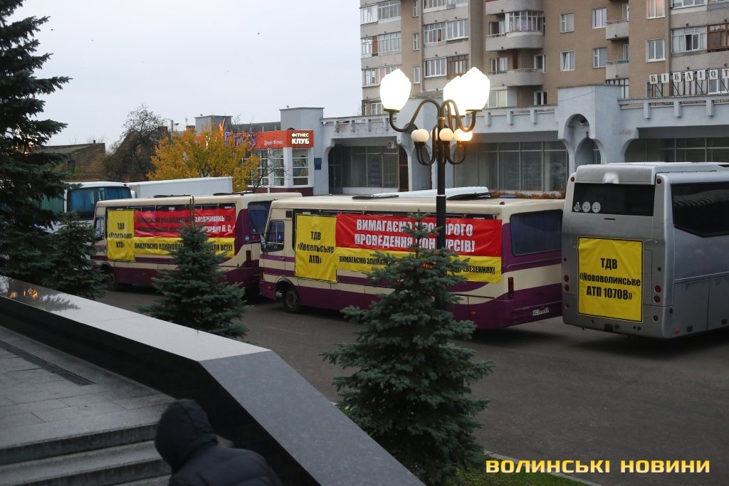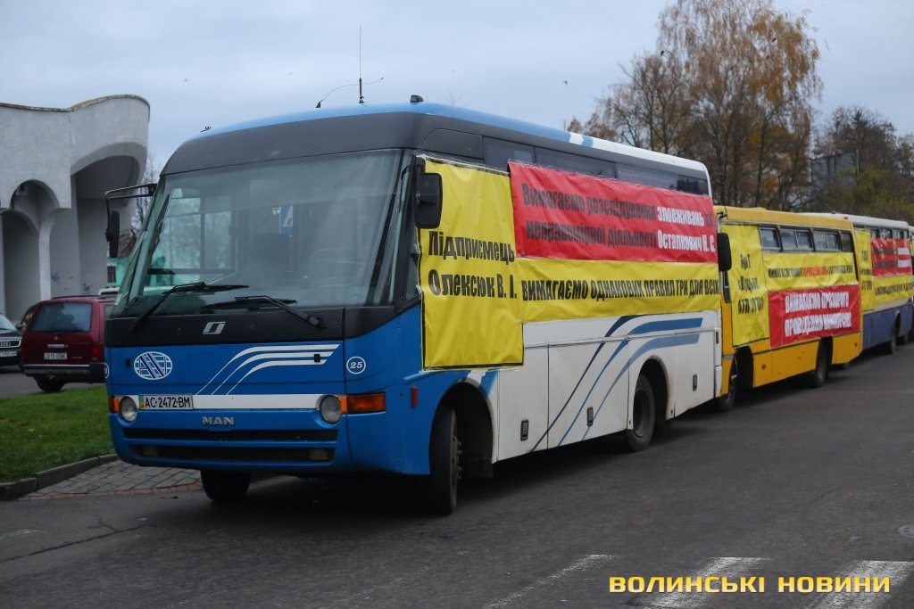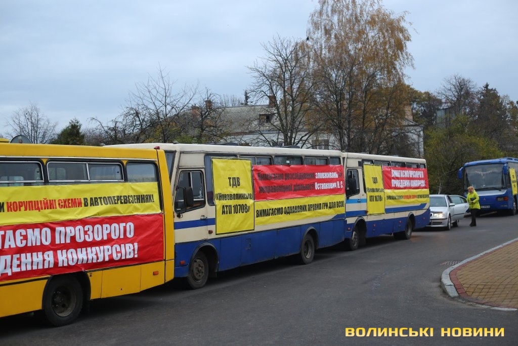 До двох десятків автобусів прибули на Київський майдан. На них розмістили банери за назвами підприємств-перевізників та вимогами прозорого проведення конкурсів, однакових правил гри для всіх та розслідувань зловживань чиновниці облдержадміністрації заступника директора департаменту інфраструктури та туризму-начальника управління транспорту та інфраструктури ОДА Наталії Остапкович. Раніше рішення департаменту перевізники оскаржували у судах, а адвокати, з його слів, розповідали, що на суди розпочинається тиск.
