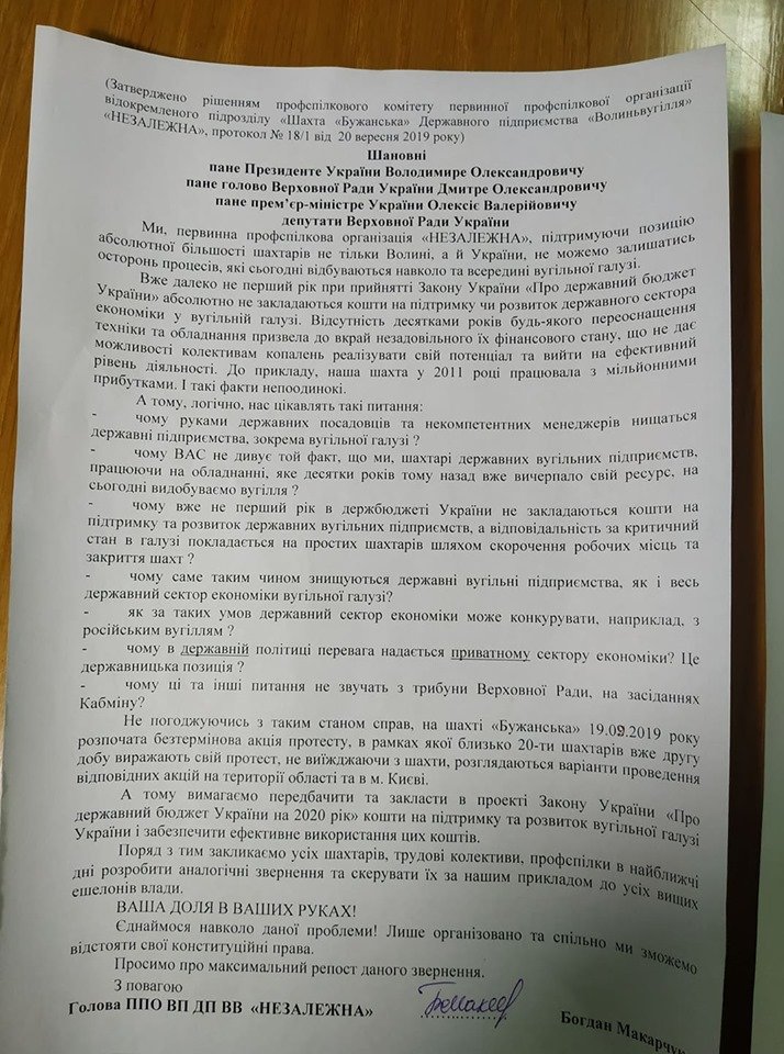 З його слів, шахтарі затвердили звернення до Президента України Володимира Зеленського, голови Верховної ради Дмитра Разумкова і прем‘єр-міністра Олексія Гончарука. У ньому йдеться про вимогу передбачити та закласти у проєкт Закону України «Про державний бюджет» кошти на підтримку і розвиток вугільної галузі і забезпечити їх ефективне використання.