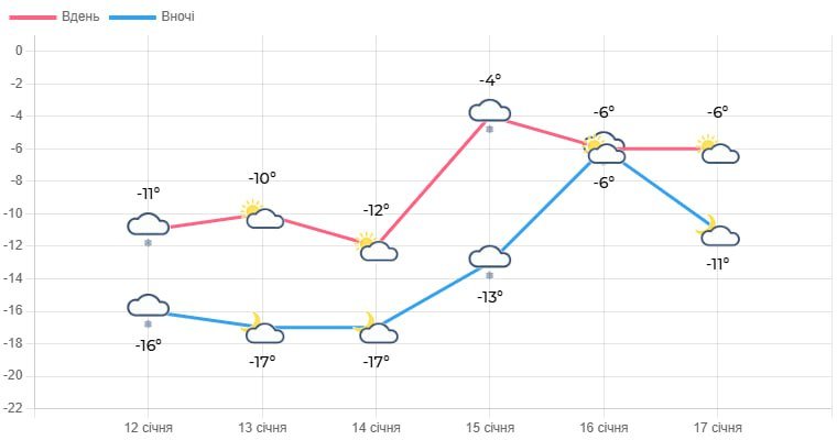У п’ятницю, 16 січня, буде хмарно з проясненнями. Місцями невеликий сніг. Вночі та вранці місцями туман. Ожеледиця. Вітер західний, 5-10 м/с. Температура вночі становитиме 5-10° морозу, вдень – 1-6° морозу.