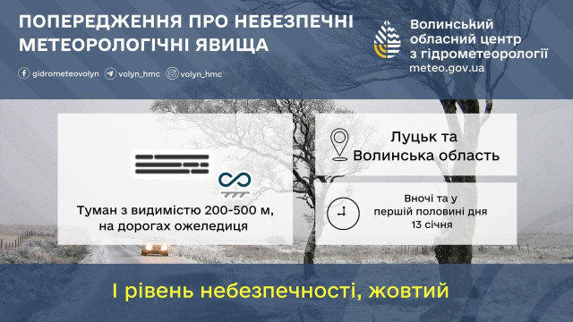 У зв’язку з туманом з видимістю 200-500 метрів, ожеледицею на дорогах у Луцьку та області загалом оголошено перший, жовтий, рівень небезпечності.У середу, 14 січня, очікують хмарну погоду з проясненнями. Без істотних опадів. Вночі та в першій половині дня місцями туман. Слабка ожеледь. Паморозь. Ожеледиця. Вітер південно-східний, 3-8 м/с. Температура вночі – 13-18° морозу, вдень – 7-12° морозу.