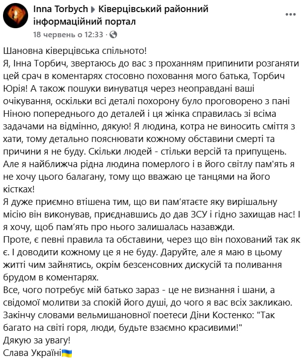 Під час скандалу зʼясувалися і нові деталі, зокрема обставини смерті Юрія Торбича. Донька загиблого попросила активіста Дмитра Мірчука, який був одним з перших, хто висвітлив інформацію про неналежне поховання Героя, з'ясувати і це.