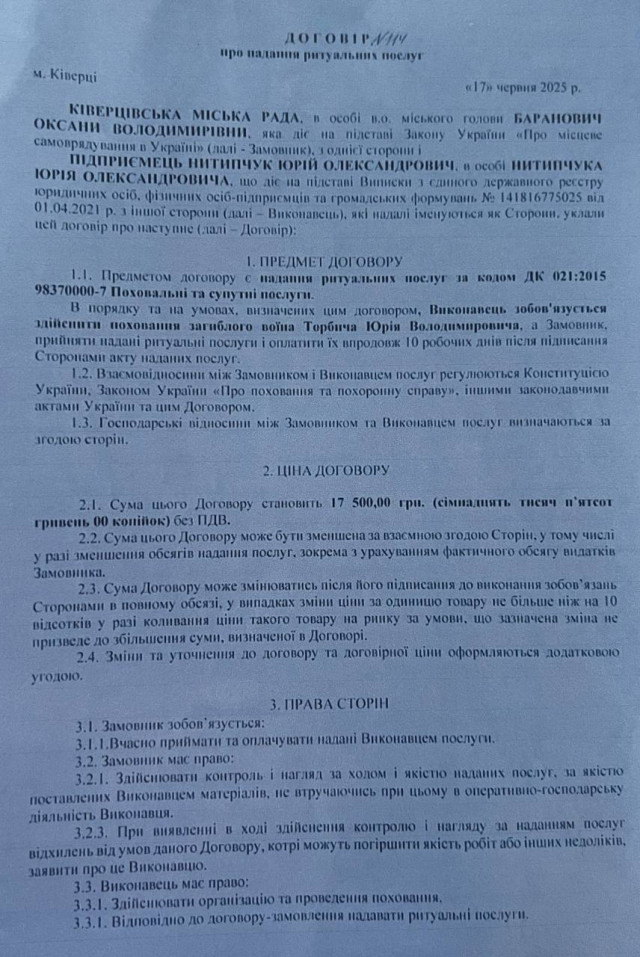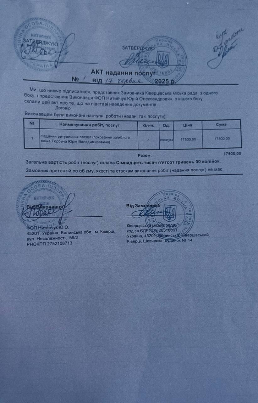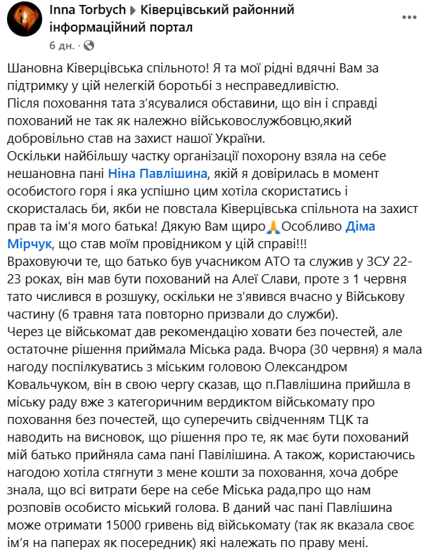 Тож у міськраді все ж мають компенсувати кошти за проведення похорону, але таке рішення ухвалили вже після підняття теми на слух у громаді.Також Інна Торбич розповіла і про те, що керівниця ритуальної служби оформила виплату від військкомату й тепер нібито може отримати суму в розмірі 15000 гривень. Своєю чергою, керівниця ритуальної служби у Ківерцях Ніна Павлішина каже: вона справді забирала свідоцтво про смерть та витяг на отримання коштів на своє прізвище, проте для отримання виплат родина померлого має дочекатися рішення від військової частини, де проходив службу Юрій, та звернутися до військкомату з пакетом документів для безпосереднього оформлення таких виплат.