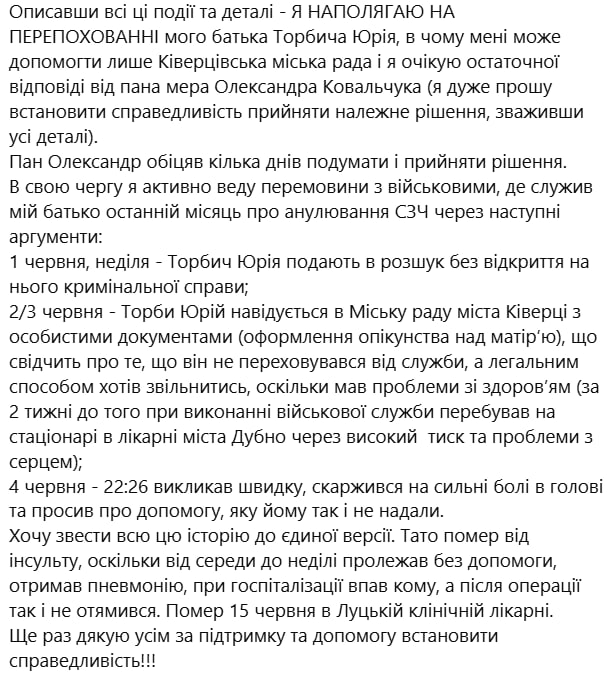 «1 червня батька подали у розшук без відкриття на нього кримінальної справи, 2-3 червня він відвідував міську раду з питанням оформлення опікунства над матірʼю, через цю ж причину у 2023 році його комісували, окрім того, він мав проблеми зі здоровʼям і за два тижні до того під час військового виконання перебував у стаціонарі в лікарні міста Дубно через високий тиск та проблеми з серцем. 4 червня вночі скаржився на сильні болі в голові. У середу ввечері батько викликав швидку і від середи в нього був інсульт, лише у неділю його знайшли, госпіталізували, і він вже перебував у комі, ще тиждень пробув у реанімації і помер. Я знаю, що тато збирав документи, аби комісуватися легально, але ця процедура затягнулася. Зараз я хочу подати клопотання у військову частину, тому що людина, яка прослужила країні, помирає з тавром «СЗЧшника» в чотири дні – це дуже прикро», – пояснює дочка померлого.