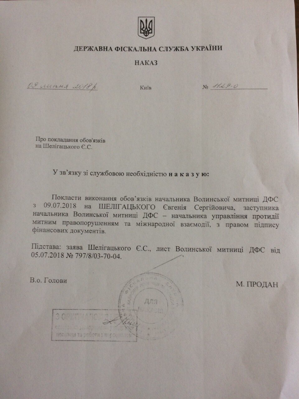Виконувачем обов’язків начальника Волинської митниці ДФС став начальник управління протидії митним правопорушенням та міжнародної взаємодії Євген Шелігацький, який в 2016 році отримав догану через пропуск через кордон рекордної партії бурштину.