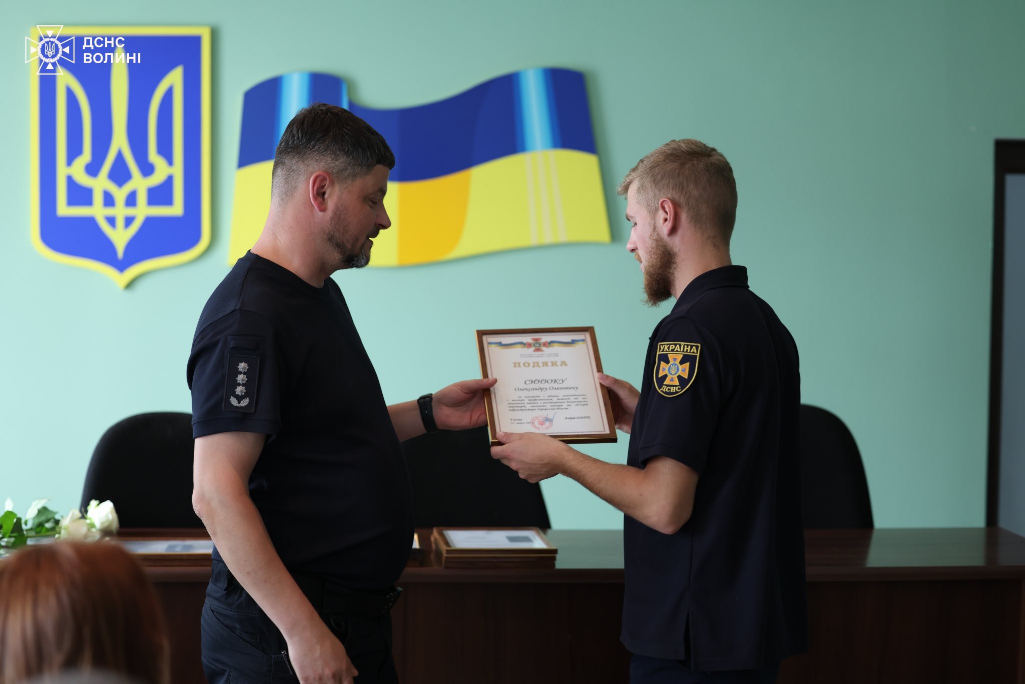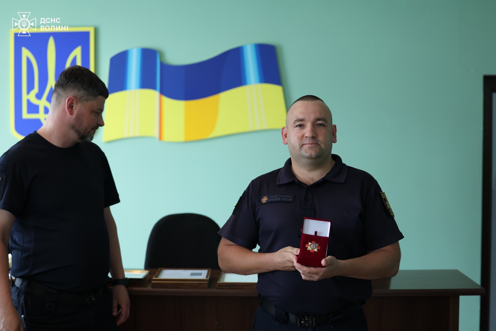 Нагрудним знаком «За відвагу в надзвичайній ситуації» нагороджені Роман Дейнека, психологу відділу соціально-гуманітарної роботи та психологічного забезпечення центру забезпечення діяльності Головного управління та Петру Шевчуку, командир відділення 1 Державної пожежно-рятувальної частини міста Луцька.