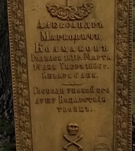 З напису на знайденій плиті можна дізнатися, що Олександр Колмаков народився 14 березня 1811 року, а помер 6 січня (обидві дати за старим стилем) 1886 року.«Під час пошуків вдалося натрапити на залишки поховання Олександра Колмакова. Самої могили немає, збереглася лише плита. Думаю, він був захоронений десь недалеко на місцевому кладовищі, – розповів Сергій Панишко. – Найцікавіше питання, на яке поки що немає остаточної відповіді: чому Колмакови після виходу на пенсію не купували землю на Чернігівщині, звідки родом, а подалися на Волинь? Моя версія наступна. Поруч зі Смолявою є село Колмів і, можливо, Миколу Колмакова як письменника і романтичну натуру зацікавила назва села, співзвучна з його прізвищем. От і придбали поруч землю. Тим більше про подібні випадки в історії відомо».