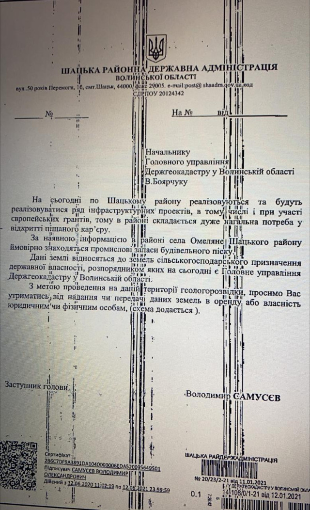 «За наявною інформацією в районі села Омеляне Шацького району ймовірно знаходяться промислові запаси будівельного піску... З метою проведення на даній території геологорозвідки, просимо Вас утриматися від надання чи передачі даних земель в оренду або власність юридичним чи фізичним особам», – вказано в документі.
