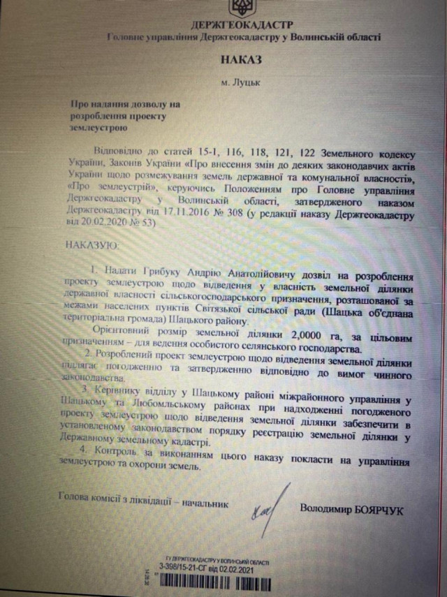 Зауважимо, що нещодавно Держгеокадастр відзвітувався міністру АПК Роману Лещенку про те, що указ Президента «Про передачу землі громадам» виконано на відмінно, та земля тепер належить громаді. Проте, як бачимо, керівництво волинських земельників і далі розпоряджається землями громади. Тобто, схоже на те, що продовжує свої схеми в обхід позиціі Уряду та продовжує дерибан особливо цінних земель Шацького району.