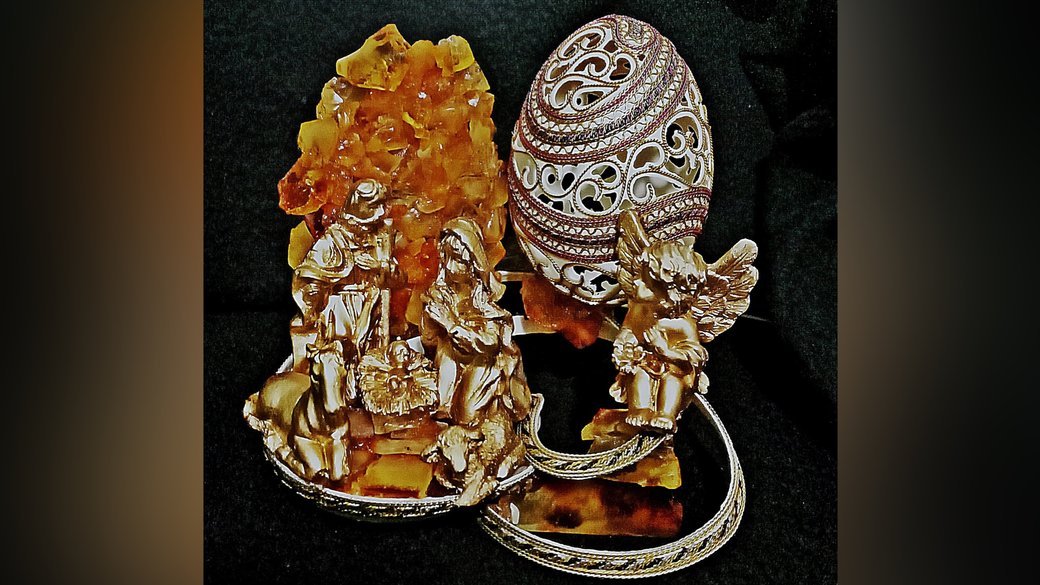 «Тут є одне гусяче яйце (праворуч), і ще одне розрізане наполовину, нарізане в смужку і закручене, все оброблене металом. Є ще дві різдвяні шопки, створені в попередні роки, одна з яких – у Всесвітньому каталозі», – каже волинянин.